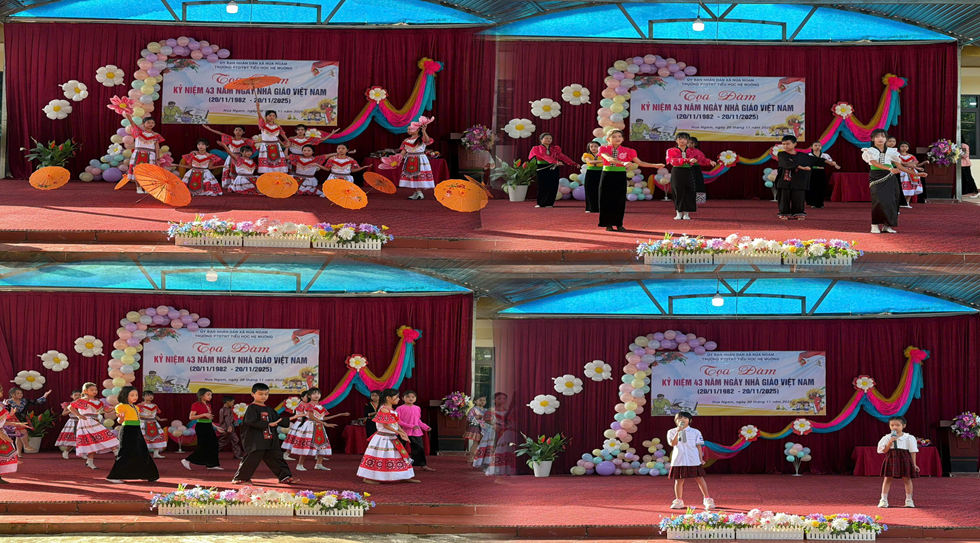 Mở đầu chương trình là một phần không thể thiếu đó là phần văn nghệ chào mừng. Trên sân khấu nhỏ, các em học sinh duyên dáng trong những bộ trang phục truyền thống, tay cầm ô, cầm hoa, biểu diễn điệu múa dịu dàng như lời tri ân gửi đến thầy cô. Ánh mắt trong veo, nụ cười hồn nhiên của các em làm cho buổi lễ thêm phần rộn rã, mang theo sự tươi trẻ và hy vọng.